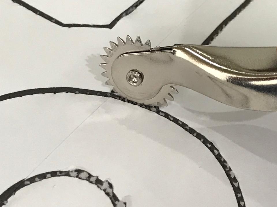 ヒイトカッターでデザインした図案を切り出す際、型紙から発泡スチロールボードにカット線を転写しておく必要がありますが、最初のヒイトカッターのパンフレットを作った時…なのでもう30年以上前からですけど、裁縫で使う「ルレット」をお薦めしています。
