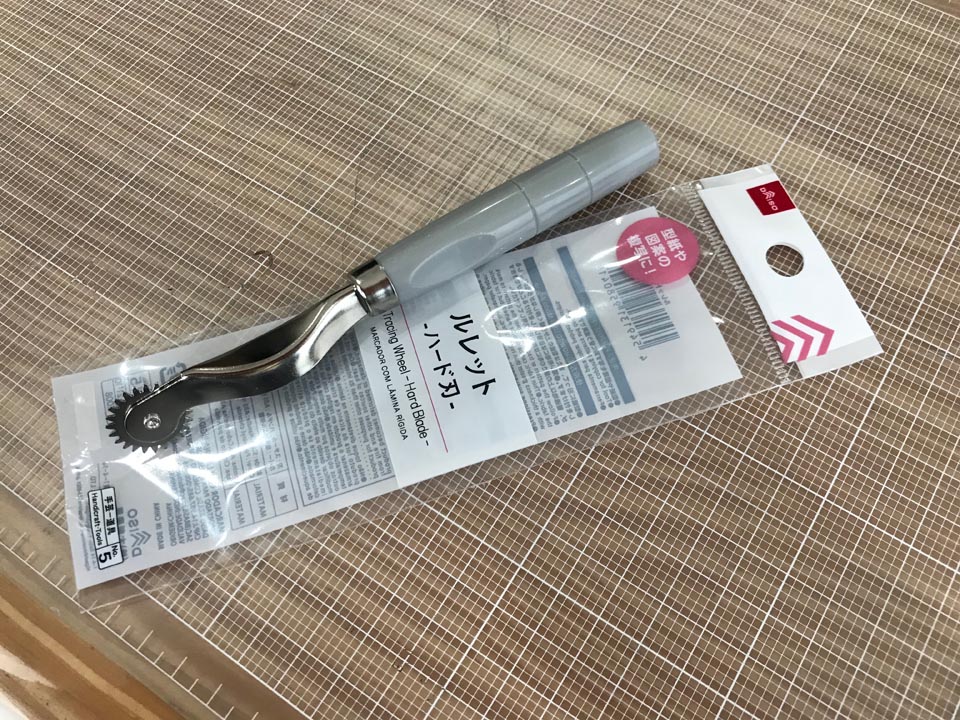 ルレットというのは洋服の型紙を生地に写すのに用いる、柄の先に小さい歯車のついた道具です。確か裁縫好きだった祖母の道具箱から借りて試してみて、使いやすかったのでパンフレットで紹介したのですが、今回改めて「もっと良い道具はないかな?」とホームセンター、手芸店、100均と巡ってみても、これ以上シンプルかつ確実な方法はやっぱりなかなか見つかりませんでした。