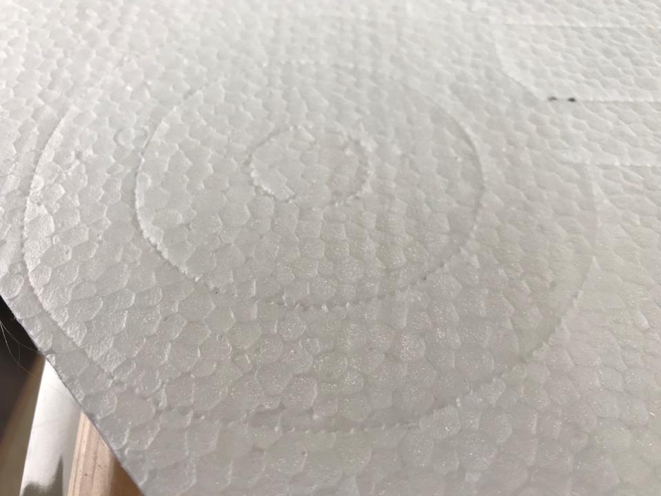 使い方はプリンターで印刷した型紙(普通紙で良い)を発泡スチロールボード表面に乗せ、仮留めして切りたい線の上をルレットでなぞるだけです。ルレットの歯車がプツプツプツ…と紙を突き抜けてボード上に点線を描いてくれます。もちろん発泡スチロールボードに直接マーカーで描いてしまっても良いのですが、切断面の溶けたスチロールにマーカーの色が混ざって取れなくなってしまうことがあるのです。後から着色する前提ならそんなに気にしなくても大丈夫ですけれども、小さな凹みが並んだ点線なら全く心配ありませんし、ガイド線としてもこの点線の視認性は充分なのです。
